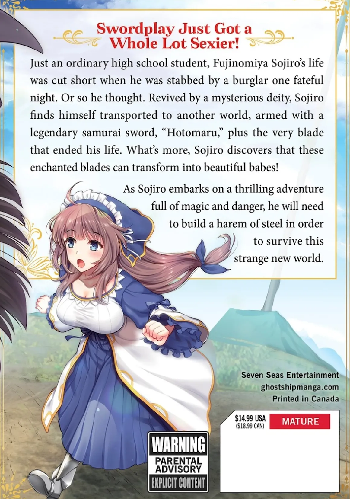Just an ordinary high school student, Fujinomiya Sojiro’s life was cut short when he was stabbed by a burglar one fateful night. Or so he thought. Revived by a mysterious deity, Sojiro finds himself transported to another world, armed with a legendary samurai sword, “Hotomaru,” plus the very blade that ended his life. What’s more, Sojiro discovers that these enchanted blades can transform into beautiful babes!