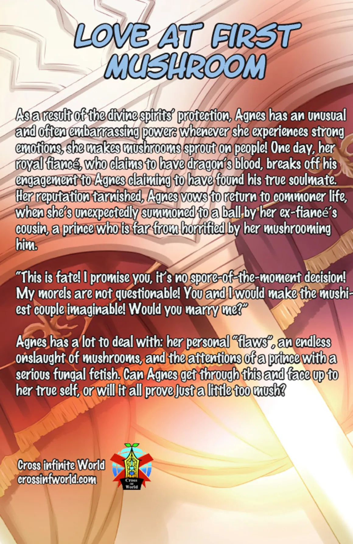As a result of the divine spirits’ protection, Agnes has an unusual and often embarrassing power: whenever she experiences strong emotions, she makes mushrooms sprout on people! One day, her royal fiancé, who claims to have dragon’s blood, breaks off his engagement to Agnes claiming to have found his true soulmate. Her reputation tarnished, Agnes vows to return to commoner life, when she’s unexpectedly summoned to a ball by her ex-fiancé’s cousin, a prince who is far from horrified by her mushrooming him.