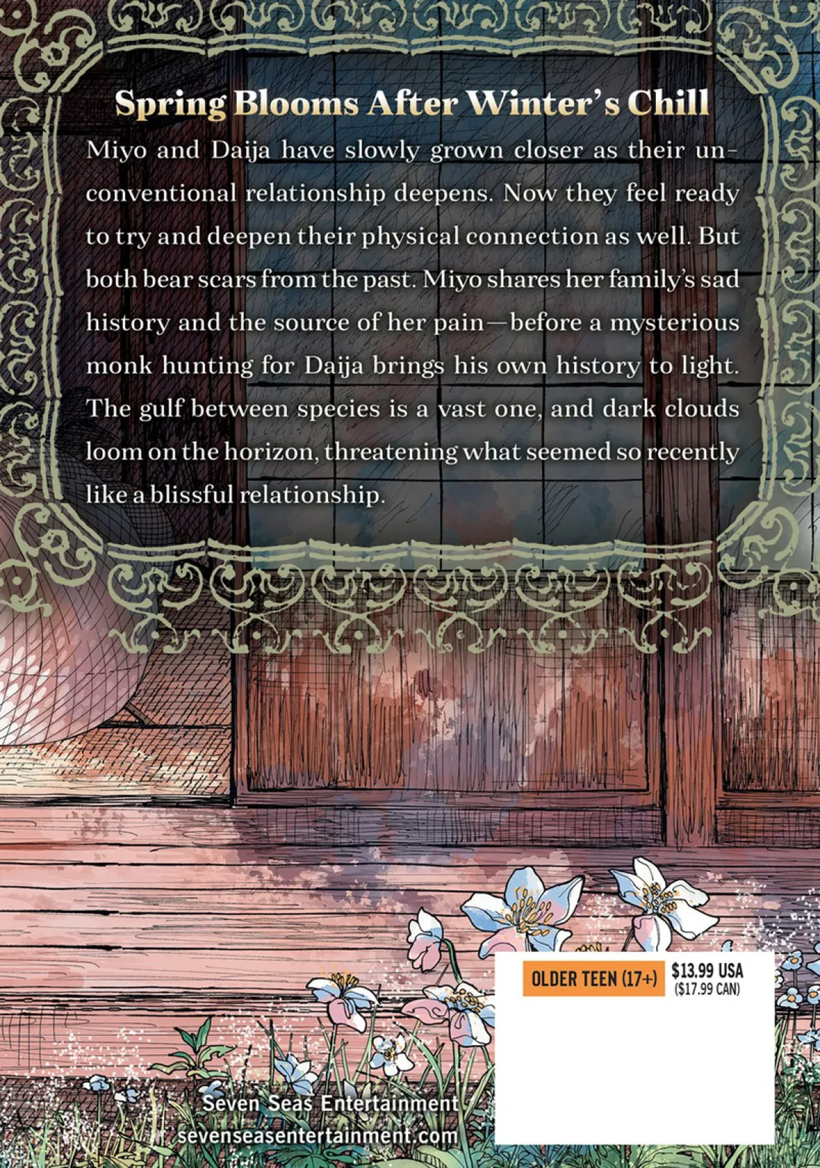 Miyo and Daija have slowly grown closer as their unconventional relationship deepens. Now they feel ready to try and deepen their physical connection as well. But both bear scars from the past. Miyo shares her family’s sad history and the source of her pain–before a mysterious monk hunting for Daija brings his own history to light. The gulf between species is a vast one, and dark clouds loom on the horizon, threatening what seemed so recently like a blissful relationship.