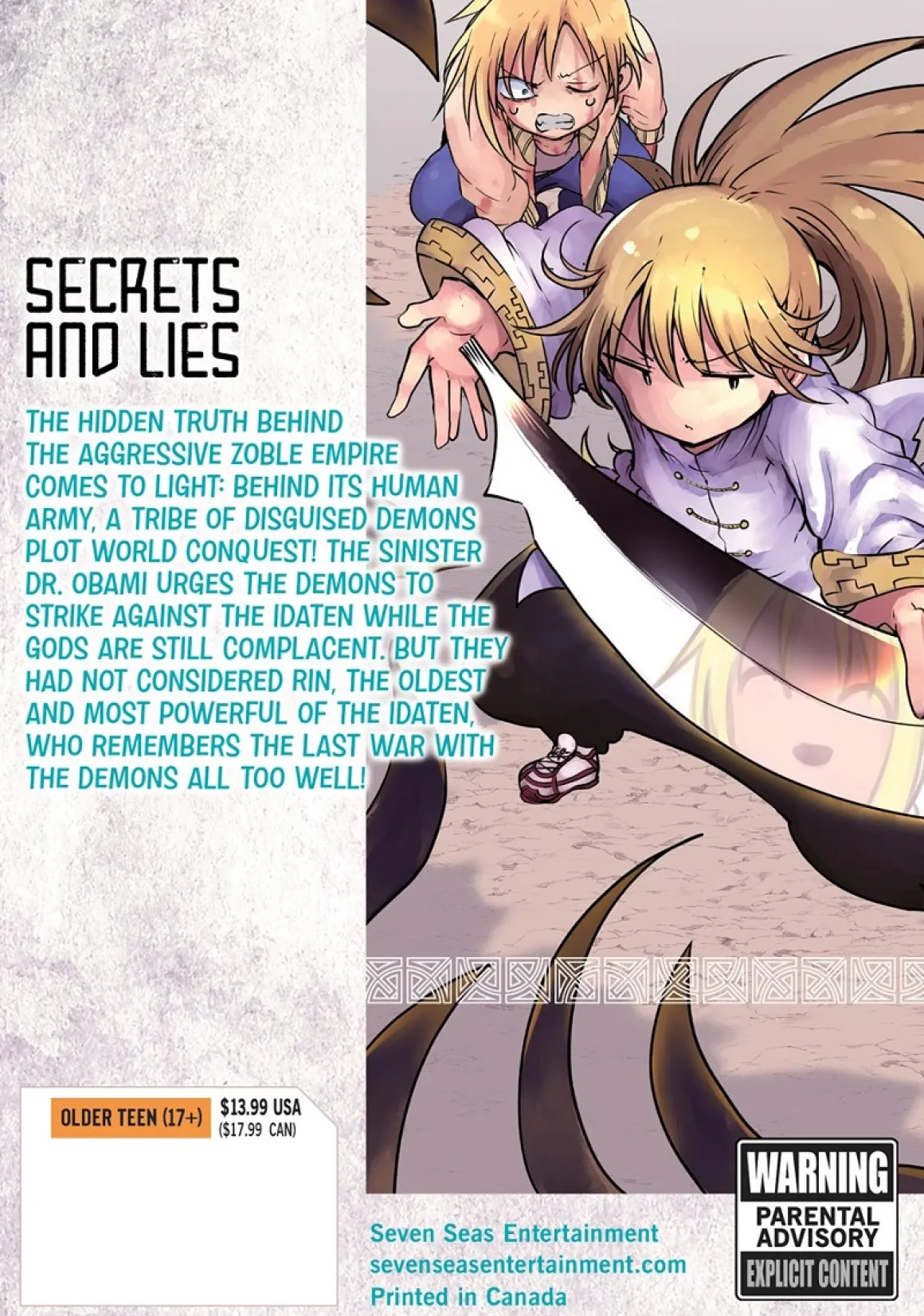 The hidden truth behind the aggressive Zoble Empire comes to light: behind its human army, a tribe of disguised demons plot world conquest! The sinister Dr. Obami urges the demons to strike against the Idaten while the gods are still complacent. But they had not considered Rin, the oldest and most powerful of the Idaten, who remembers the last war with the demons all too well!