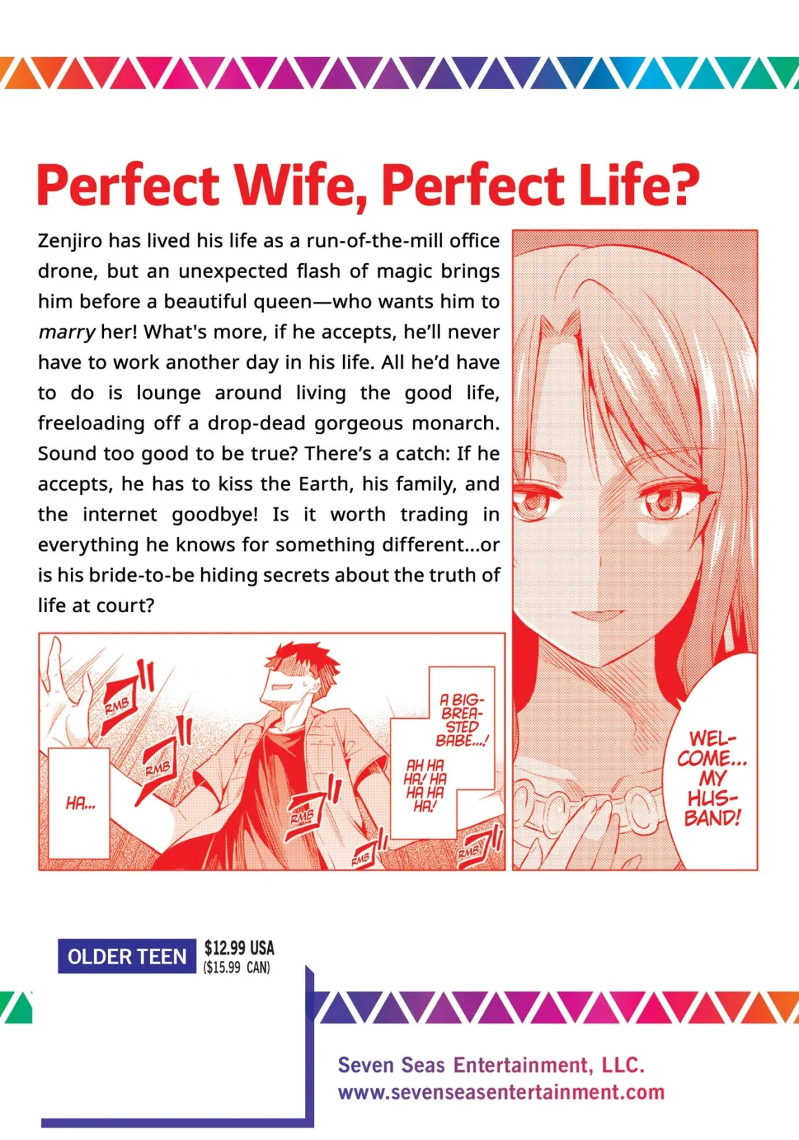 Zenjiro has lived his life as a run-of-the-mill office drone, but an unexpected flash of magic brings him before a beautiful queen–who wants him to marry her! What’s more, if he accepts, he’ll never have to work another day in his life. All he’d have to do is lounge around living the good life, freeloading off a drop-dead gorgeous monarch. Sound too good to be true? There’s a catch: If he accepts, he has to kiss the Earth, his family, and the internet goodbye! Is it worth trading in everything he knows for something different…or is his bride-to-be hiding secrets about the truth of life at court?