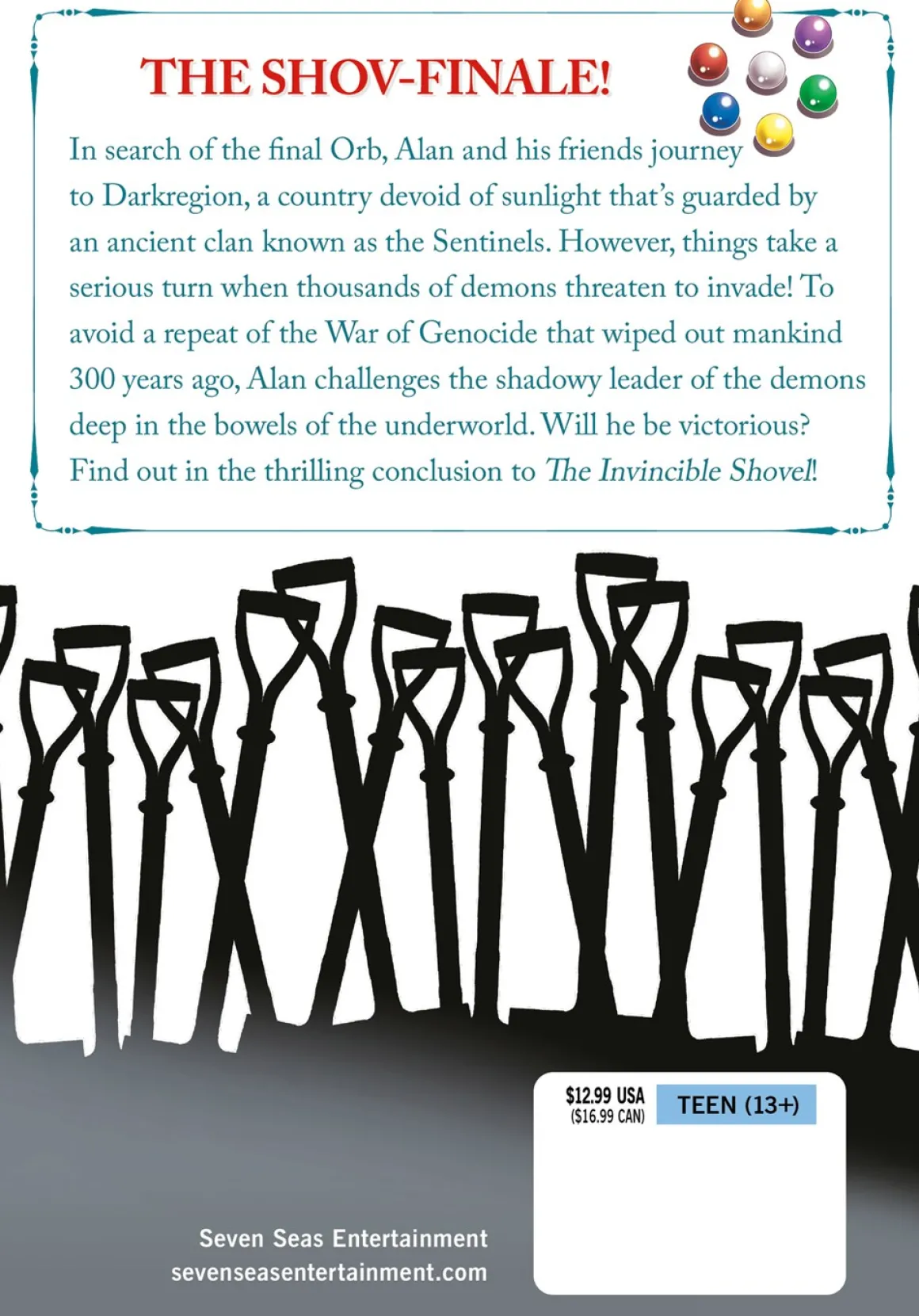 In search of the final Orb, Alan and his friends journey to Darkregion, a country devoid of sunlight that’s guarded by an ancient clan known as the Sentinels. However, things take a serious turn when thousands of demons threaten to invade! To avoid a repeat of the War of Genocide that wiped out mankind 300 years ago, Alan challenges the shadowy leader of the demons deep in the bowels of the underworld. Will he be victorious? Find out in the thrilling conclusion to The Invincible Shovel!
