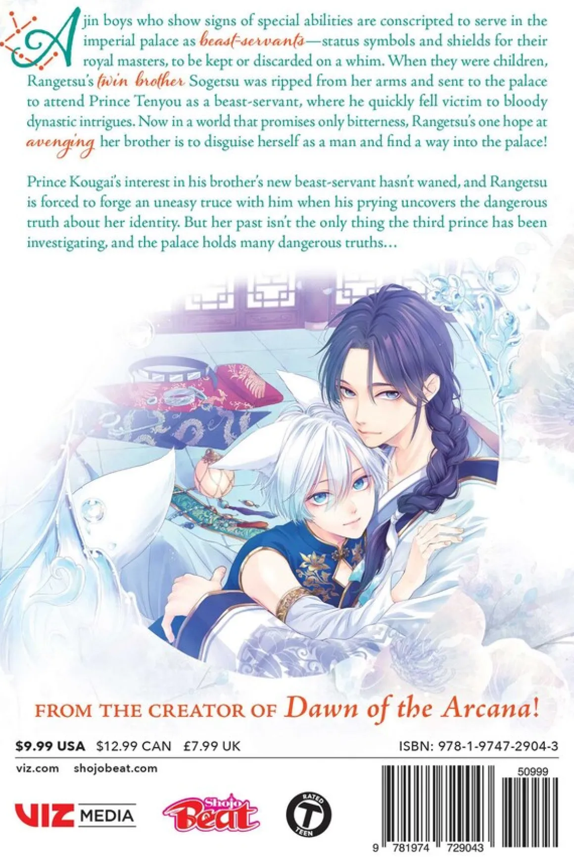 Prince Kougai’s interest in his brother’s new beast-servant hasn’t waned, and Rangetsu is forced to forge an uneasy truce with him when his prying uncovers the dangerous truth about her identity. But her past isn’t the only thing the third prince has been investigating, and the palace holds many dangerous truths…