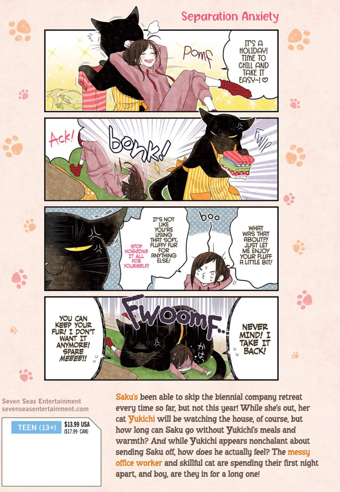 Saku’s been able to skip the biennial company retreat every time so far, but not this year! While she’s out, her cat Yukichi will be watching the house, of course, but how long can Saku go without Yukichi’s meal and warmth? And while Yukichi appears nonchalant about sending Saku off, how does he actually feel? The messy office worker and skillful cat are spending their first night apart, and boy, are they in for a long one!