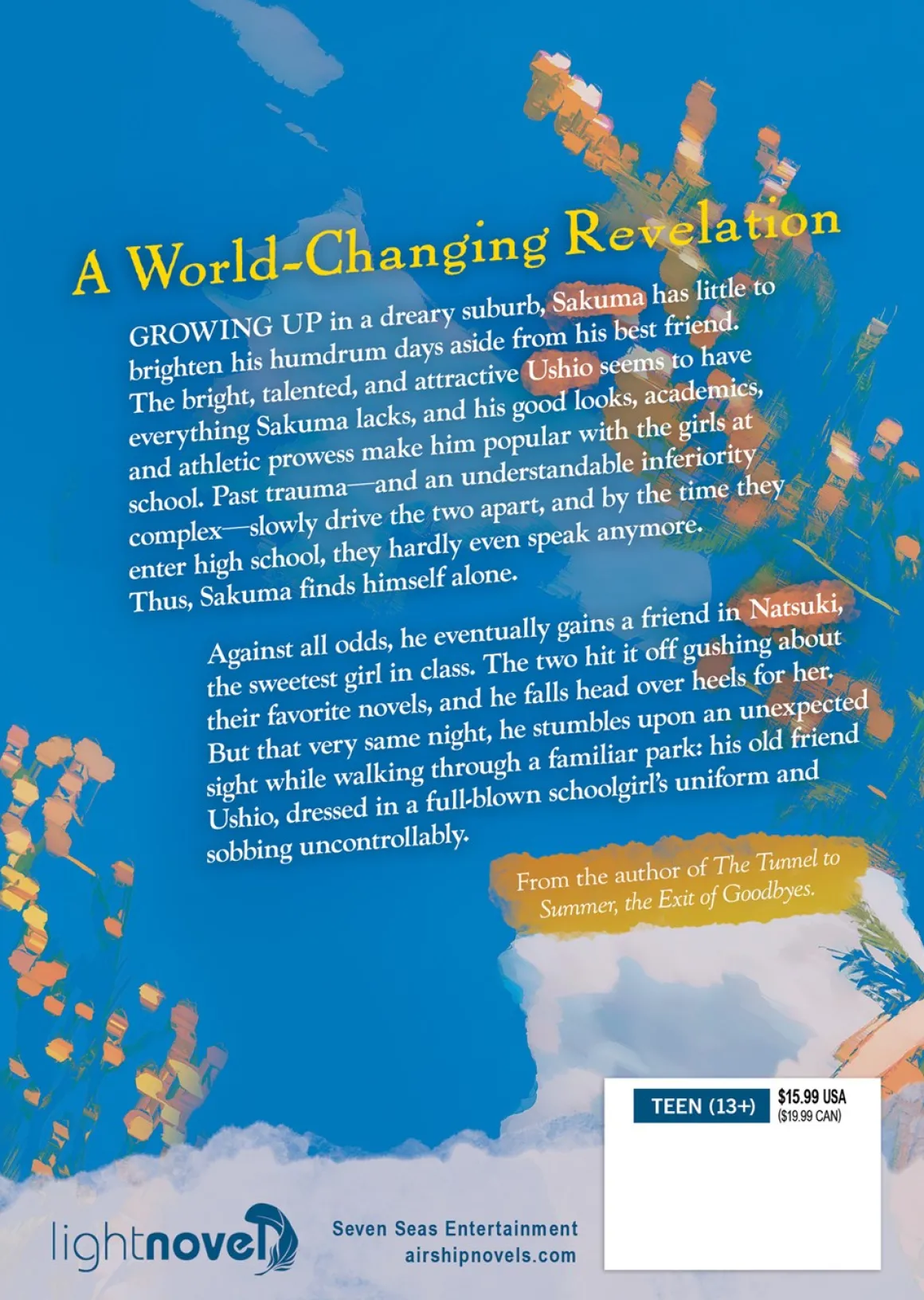 Against all odds, he eventually gains a friend in Natsuki, the sweetest girl in class. The two hit it off gushing about their favorite novels, and he falls head over heels for her. But that very same night, he stumbles upon an unexpected sight while walking through a familiar park: his old friend Ushio, dressed in a full-blown schoolgirl’s uniform and sobbing uncontrollably.