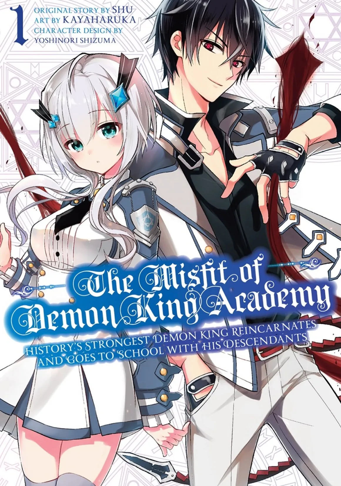The Misfit of Demon King Academy: History’s Strongest Demon King Reincarnates and Goes to School with His Descendants manga volume 1 features story by Shu with art by Yoshinori Shizuma and Kayaharuka.