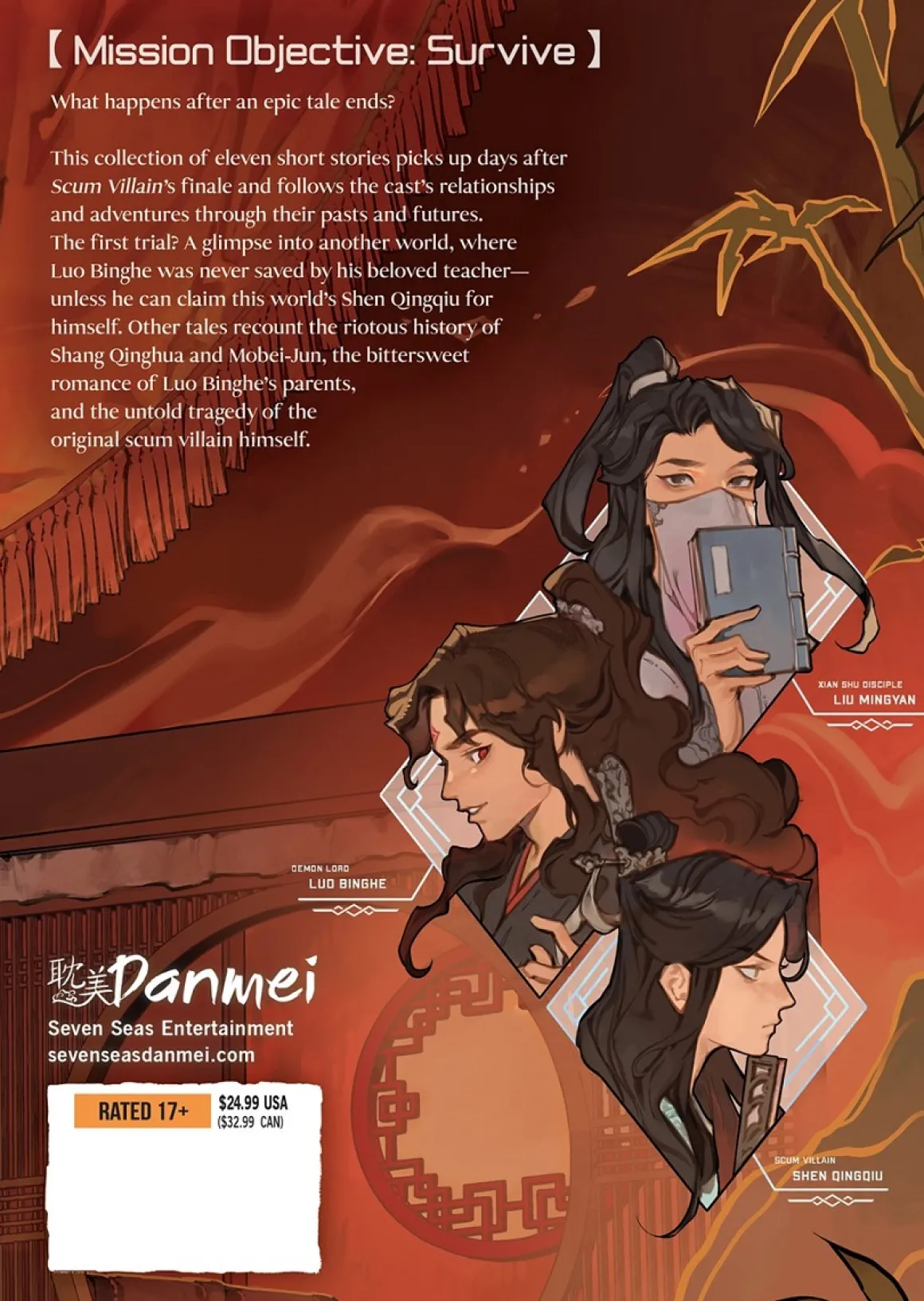This collection of eleven short stories picks up days after Scum Villain’s finale and follows the cast’s relationships and adventures through their pasts and futures. The first trial? A glimpse into another world, where Luo Binghe was never saved by his beloved teacher—unless he can claim this world’s Shen Qingqiu for himself. Other tales recount the riotous history of Shang Qinghua and Mobei-Jun, the bittersweet romance of Luo Binghe’s parents, and the untold tragedy of the original scum villain himself.