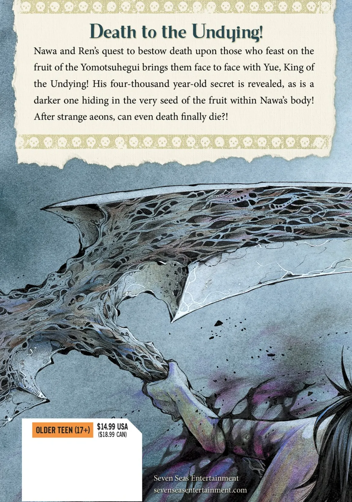 Nawa and Ren’s quest to bestow death upon those who feast on the fruit of the Yomotsuhegui brings them face to face with Yue, King of the Undying! His four-thousand year-old secret is revealed, as is a darker one hiding in the very seed of the fruit within Nawa’s body. After strange aeons, can even death finally die?!