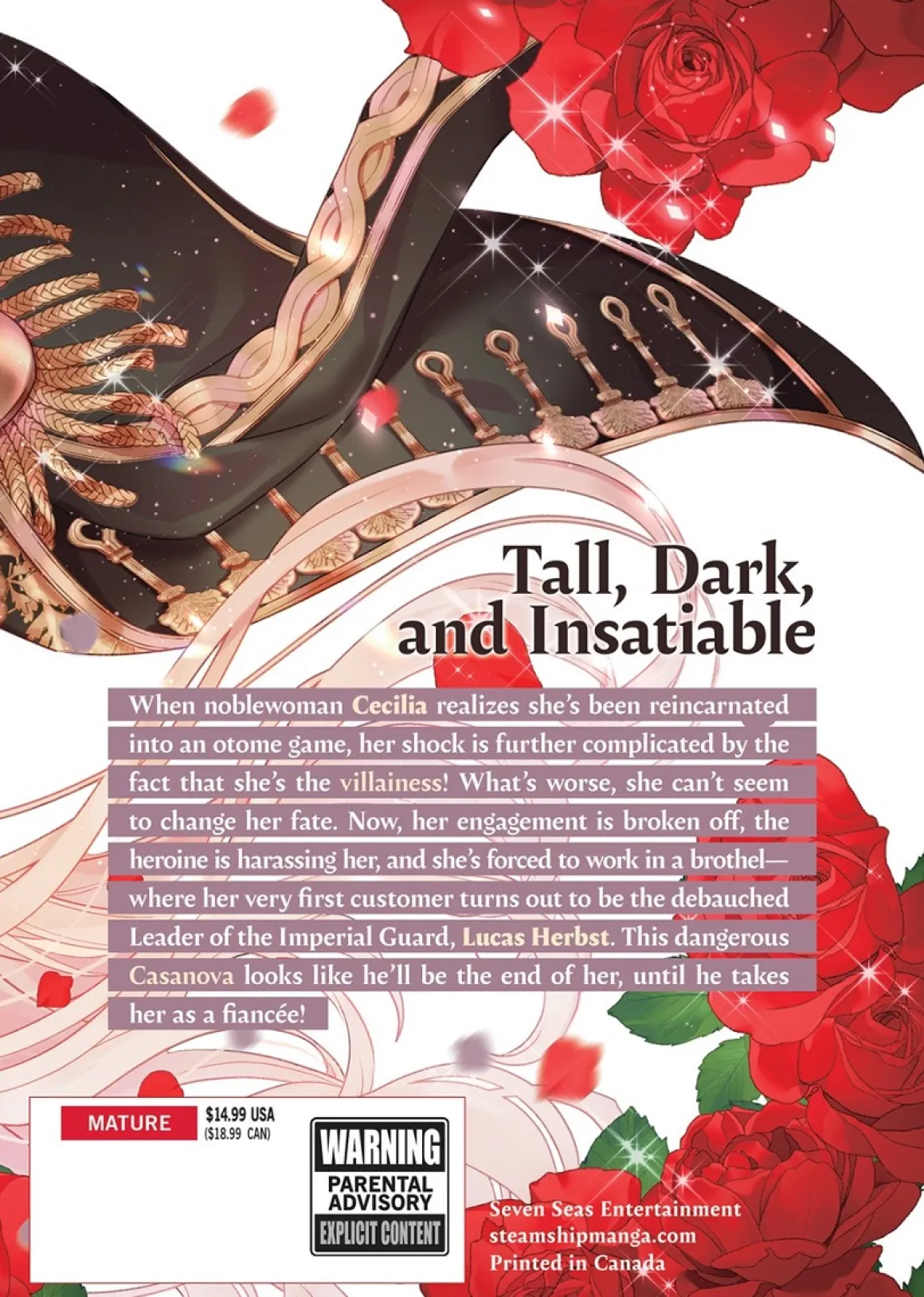 When noblewoman Cecilia realizes she’s been reincarnated into an otome game, her shock is further complicated by the fact that she’s the villainess! What’s worse, she can’t seem to change her fate. Now, her engagement is broken off, the heroine is harassing her, and she’s forced to work in a brothel—where her very first customer turns out to be the debauched Leader of the Imperial Guard, Lucas Herbst. This dangerous Casanova looks like he’ll be the end of her, until he takes her as a fiancée!
