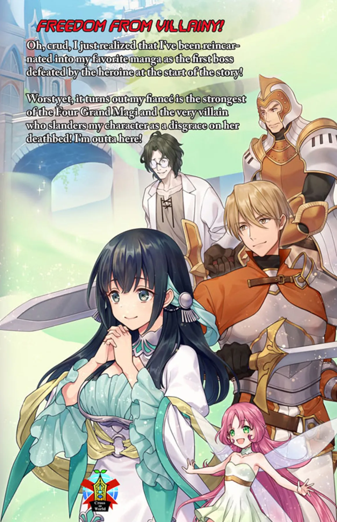 Oh, crud, I just realized that I’ve been reincarnated into my favorite manga as the first boss defeated by the heroine at the start of the story! Worst yet, it turns out my fiancé is the strongest of the Four Grand Magi and the very villain who slanders my character as a disgrace on her deathbed! I’m outta here!