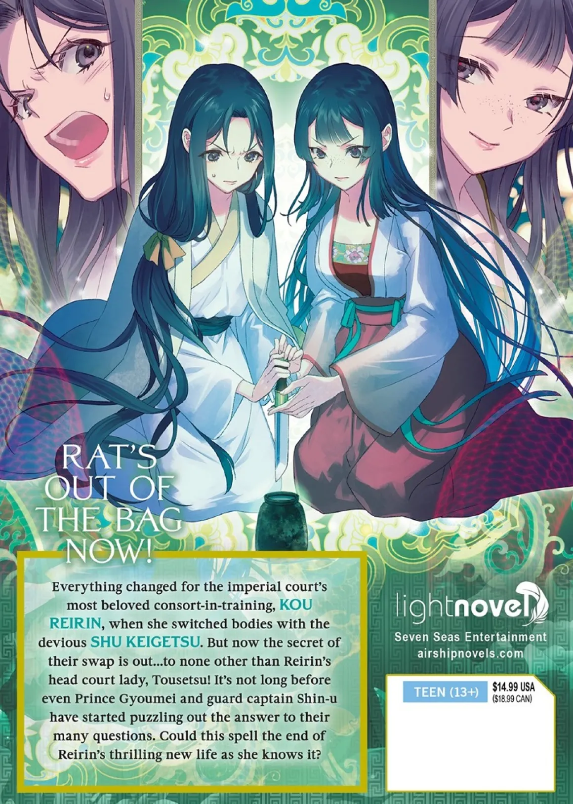 Everything changed for the imperial court’s most beloved consort-in-training, Kou Reirin, when she switched bodies with the devious Shu Keigetsu. But now the secret of their swap is out…to none other than Reirin’s head court lady, Tousetsu! It’s not long before even Prince Gyoumei and guard captain Shin-u have started puzzling out the answer to their many questions. Could this spell the end of Reirin’s thrilling new life as she knows it?