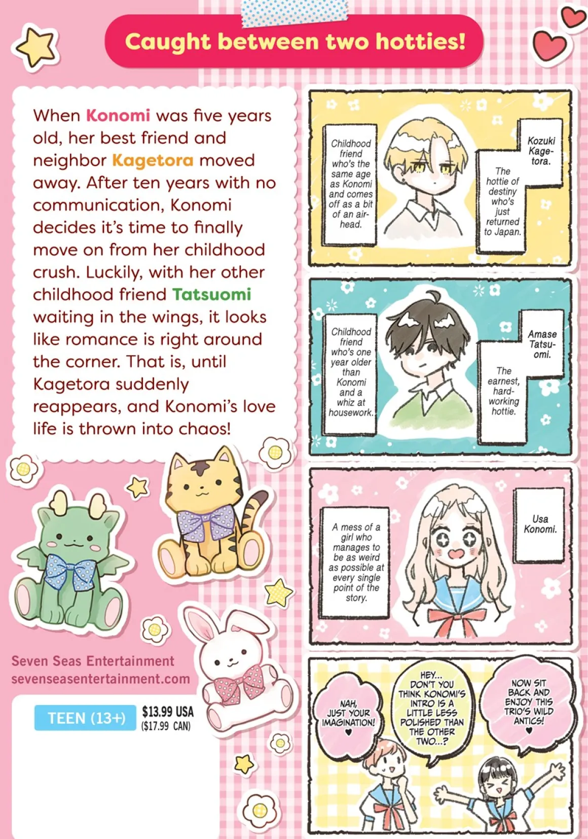 When Konomi was five years old, her best friend and neighbor Kagetora moved away. After ten years with no communication, Konomi decides it’s time to finally move on from her childhood crush. Luckily, with her other childhood friend Tatsuomi waiting in the wings, it looks like romance is right around the corner. That is, until Kagetora suddenly reappears, and Konomi’s love life is thrown into chaos!
