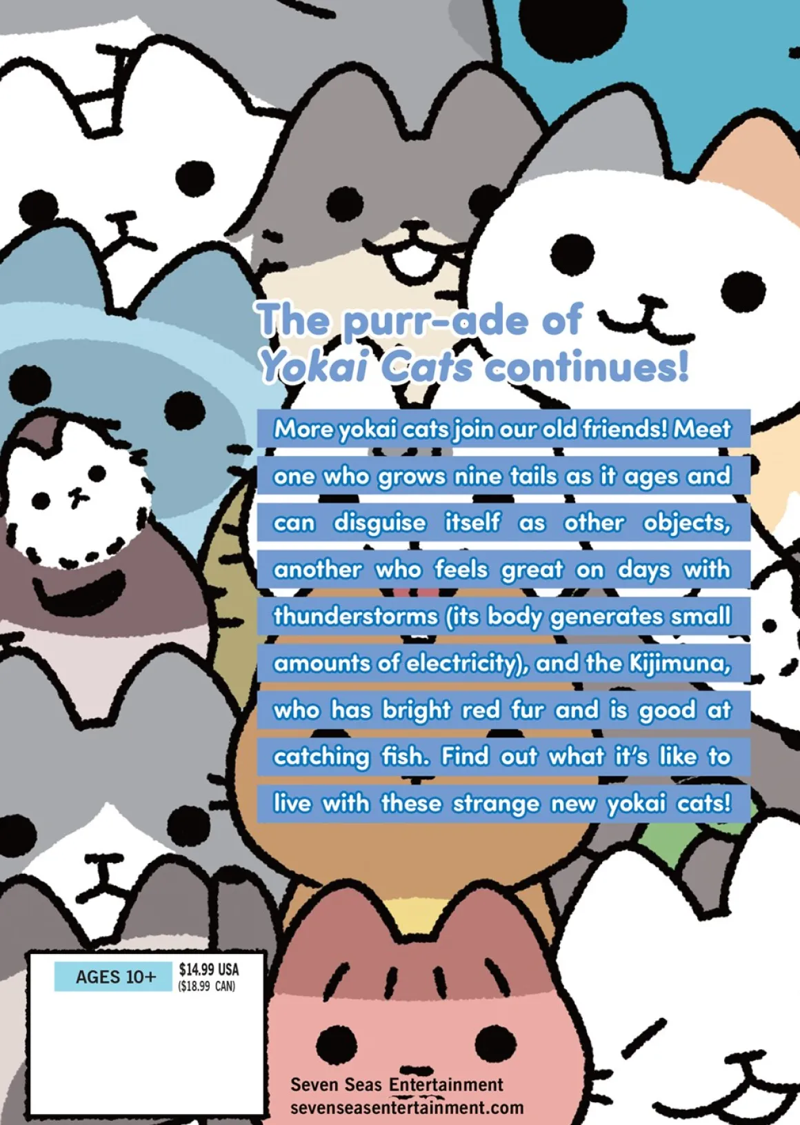 More yokai cats join our old friends! Meet one who grows nine tails as it ages and can disguise itself as other objects, another who feels great on days with thunderstorms (its body generates small amounts of electricity), and the Kijimuna, who has bright red fur and is good at catching fish. Find out what it’s like to live with these strange new yokai cats!