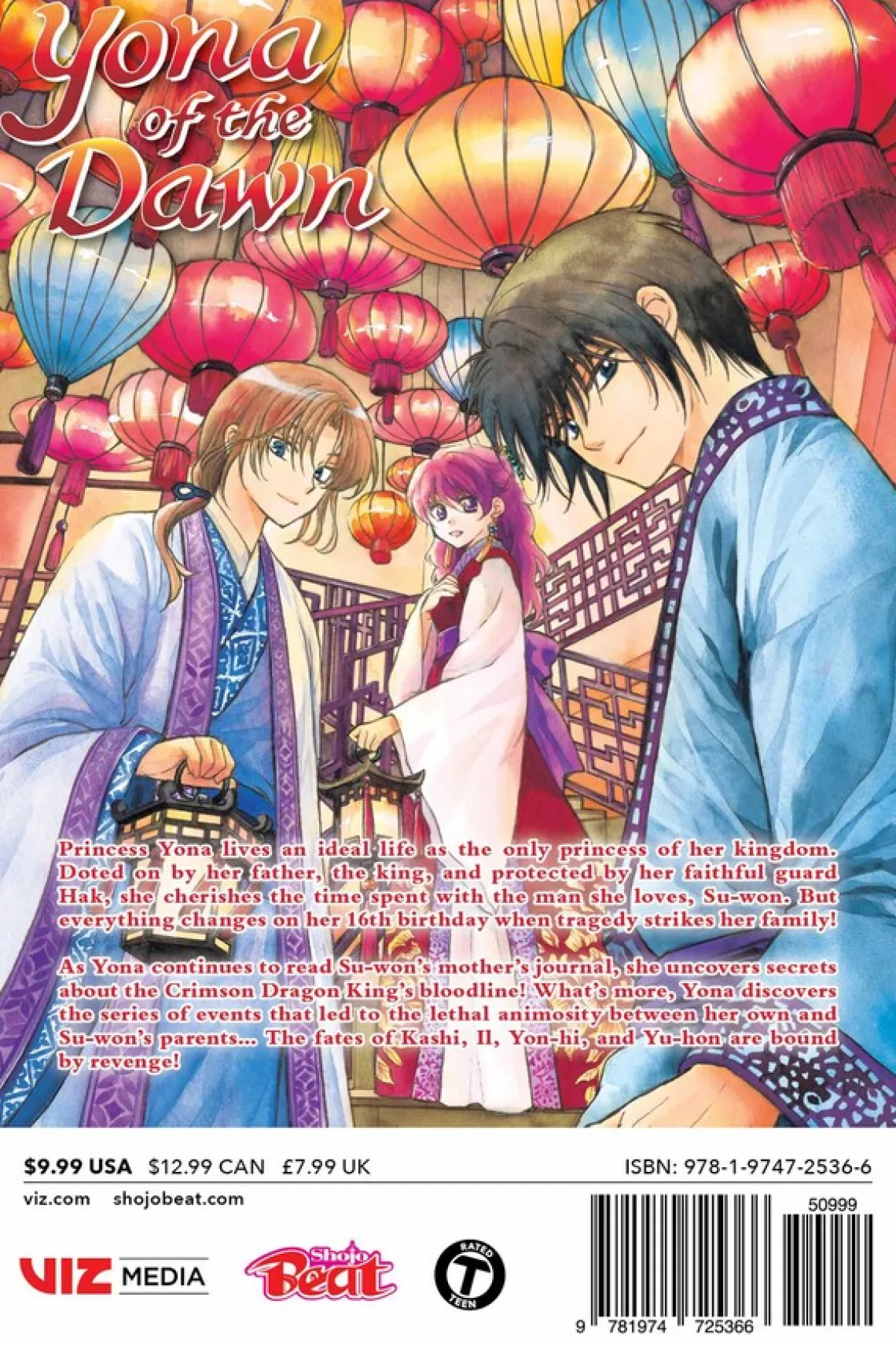 As Yona continues to read Su-won’s mother’s journal, she uncovers secrets about the Crimson Dragon King’s bloodline! What’s more, Yona discovers the series of events that led to the lethal animosity between Su-won’s parents and her own… The fates of Kashi, Il, Yon-hi, and Yu-hon are bound by revenge!